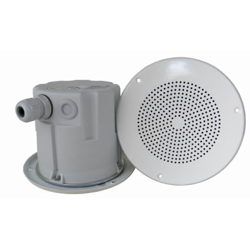 Ceiling-mounted explosion-proof loudspeakers are designed for safe audio distribution in hazardous areas with gas and dust. The series includes models in both plastic and metal, with various power ratings and mounting options—including fire dome versions, dust boxes, and A+B redundancy systems.