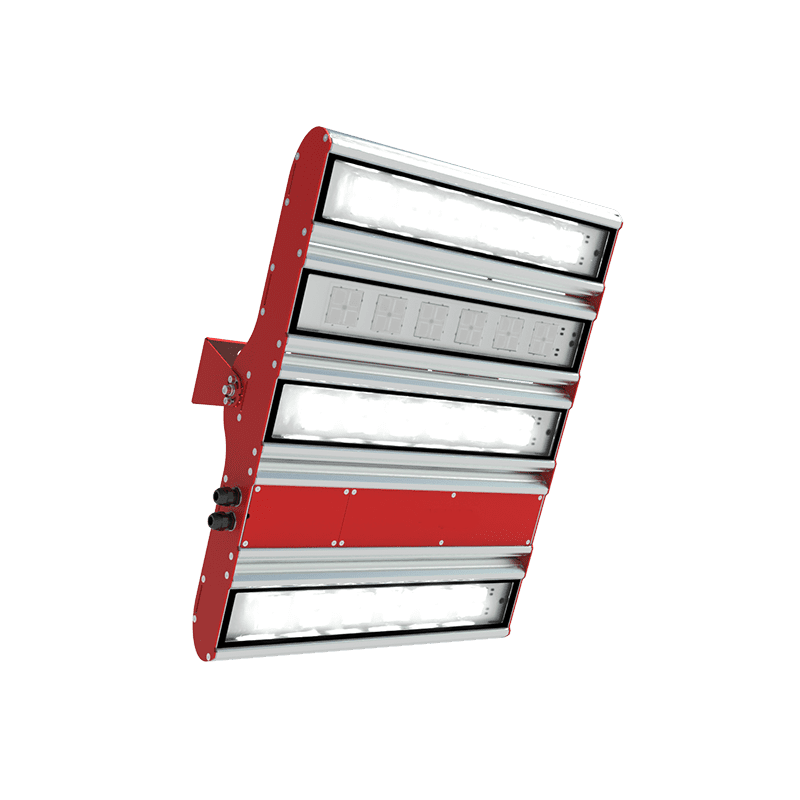 Explosion‑protected floodlight with LED modules, equipped with a built‑in battery (3 hours) for emergency lighting.