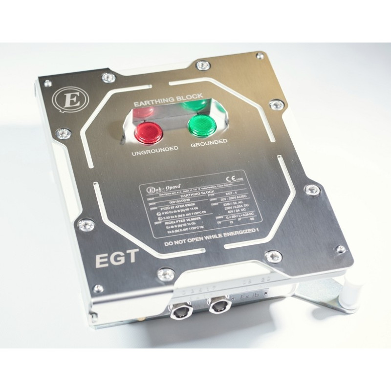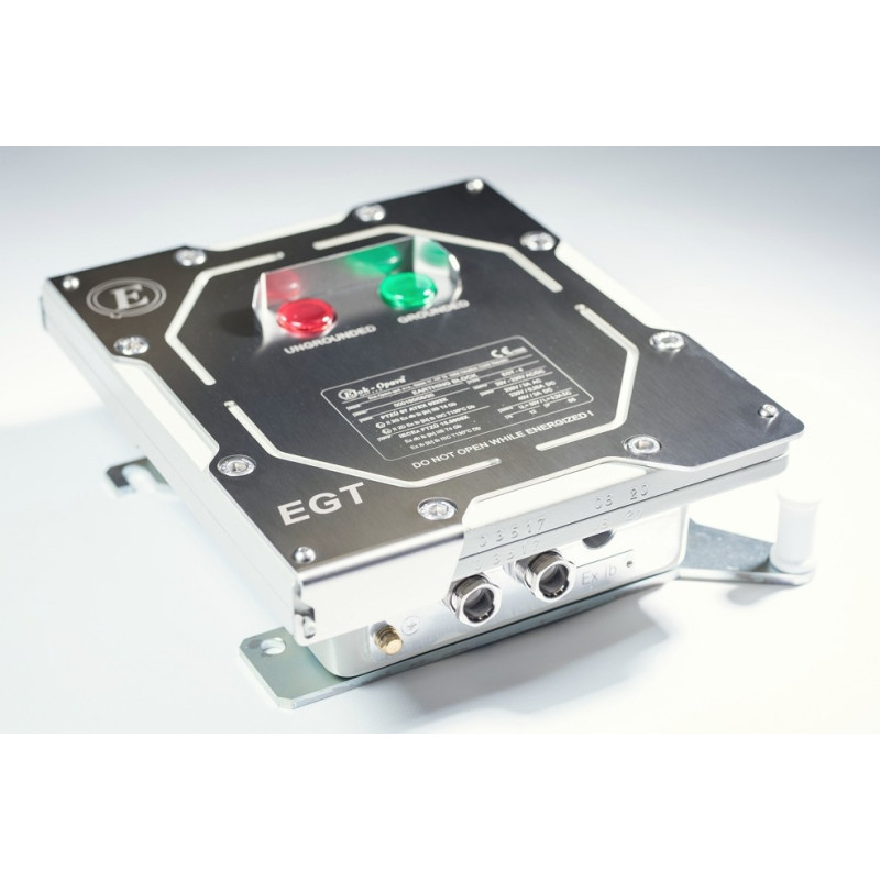 Jordningsenhet för säker urladdning av statisk elektricitet vid lastning och lossning av fordon, containrar och storsäckar. Den är ATEX- och IECEx-certifierad och övervakar kontinuerligt jordningskvaliteten för att förhindra farliga gnistbildningar.